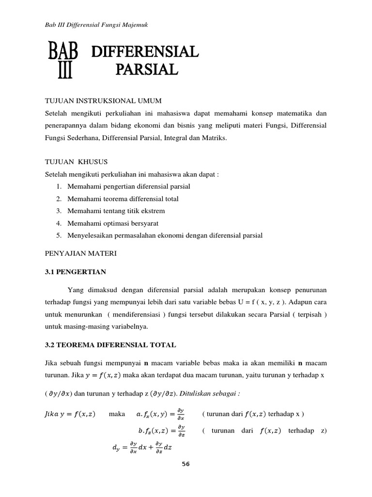 Bantu jawab dan dapatkan poin. Dipunyai dua buah mata dadu bermata enam akan dilempar bersamaan. Derivatif parsial sebuah fungsi dengan satu variabel bebas hanya akan mempunyai satu macam turunan. Contoh soal aplikasi turunan parsial. Dari haisil nilai fungsi di atas, nilai minimum fungsi $ f(x) \, $ adalah $ 3 $. Jika akan dilakukan pengambilan sebuah bola secara acak, tentukan peluang terambil bola bernomer ganjil atau prima! Meminimumkan biaya rata rata dalam produksi suatu barang biaya totalnya adalah tc 0 4q2 500q 16000 rupiah. Jika y = f(x) maka turunannya turunan y terhadap x yaitu y. Contoh soal dan pembahasan tentang turunan dalam garis singgung; Contoh soal dan pembahasan tentang turunan fungsi. Matematika ekonomi diferensial fungsi majemuk disusun oleh: Contoh soal peluang kejadian majemuk. 5 tentukan turunan dari fungsi fungsi berikut nyatakan hasil akhir dalam.