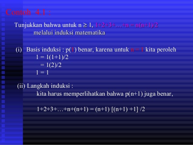 Sep 13, 2012 · semoga link download presentasi power point matematika sma/ma kelas x, xi dan xii gratis ini bisa membantu bapak/ibu guru dalam menyiapkan perangkat pembelajarannya. Pernyataan yang dimaksudkan dibatasi hanya pada pernyataan yang menyangkut bilangan bulat. Induksi matematik if2151 matematika diskrit metode pembuktian untuk pernyataan perihal bilangan bulat adalah induksi matematik. Tunjukkan bahwa untuk n 1, bahwa1, bahwa nn33 + 2n+ 2n adalah kelipatanadalah kelipatan 33 melalui induksi matematikamelalui induksi matematika (i) basis induksi : P (1) benar, karena untuk n = 1, 13 + 2 (1) = 3 adalah kelipatan 3 (ii) langkah induksi : Jul 03, 2015 · induksi matematika 1. Induksi matematika powerpoint ppt presentations. Bab iv induksi matematika induksi matematika adalah : Induksi matematika digunakan untuk mengecek hasil proses yang terjadi secara berulang sesuai dengan pola tertentu. Metode pembuktian untuk pernyataan perihalpembuktian untuk pernyataan perihal bilangan bulat.bilangan bulat. Prasyarat dari induksi matematika itu notasi σ. Itulah sebabnya pertemuan lalu bapak memberikan materi notasi σ diberikan deret s(n)=1+2+3+4+5+…+n dengan notasi σ yang telah kalian pelajari maka deret tersebut cukup ditulis s(n)=∑ i−1. Aug 09, 2015 · contoh 4.3 :