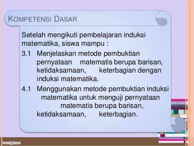 Kumpulan power point matematika sma dan rpp kurikulum 2013 blog ini berisikan kumpulan power point beserta rpp kurikulum 2013, khususnya materi ajar matematika untuk sekolah menengah atas, semoga bermanfaat bagi seluruh pengguna serta diharapkan kritik dan sarannya. Jul 03, 2015 · induksi matematika 1. Tunjukkan bahwa untuk n 1, bahwa1, bahwa nn33 + 2n+ 2n adalah kelipatanadalah kelipatan 33 melalui induksi matematikamelalui induksi matematika (i) basis induksi : Induksi matematik if2151 matematika diskrit metode pembuktian untuk pernyataan perihal bilangan bulat adalah induksi matematik. Sep 13, 2012 · semoga link download presentasi power point matematika sma/ma kelas x, xi dan xii gratis ini bisa membantu bapak/ibu guru dalam menyiapkan perangkat pembelajarannya.