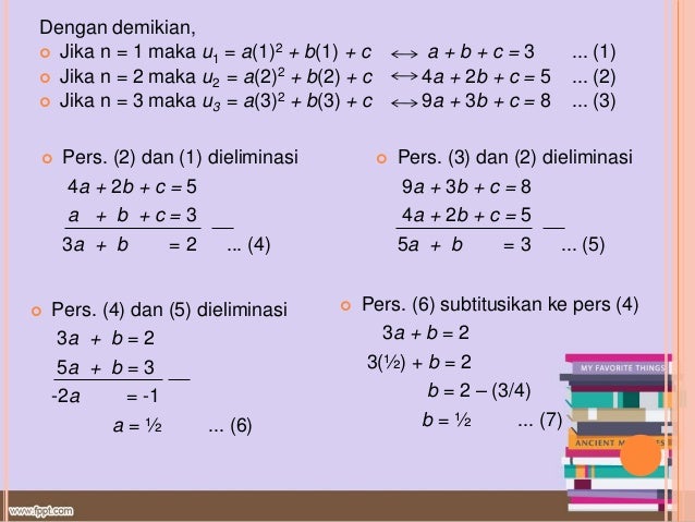 Aug 09, 2015 · contoh 4.3 : Itulah sebabnya pertemuan lalu bapak memberikan materi notasi σ diberikan deret s(n)=1+2+3+4+5+…+n dengan notasi σ yang telah kalian pelajari maka deret tersebut cukup ditulis s(n)=∑ i−1. Feb 17, 2013 · pada kelas xi, materi presentasi power point matematika sma akan membahas tentang statistika, peluang, trigonometri, lingkaran, suku banyak, limit dan turunan.sedangkan pada kelas xii, ppt materi matematika sma akan membahas tentang integral, matriks, sistem persamaan linear, irisan kerucut, dan beberapa materi persiapan un bagi siswa. Induksi matematika powerpoint ppt presentations. Prasyarat dari induksi matematika itu notasi σ.