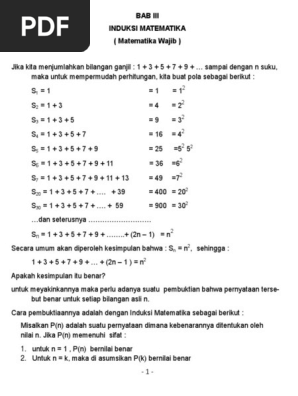 Lembar Aktivitas Siswa Induksi Matematika Dengan Induksi Matematika Bahwa Untuk Semua N Anggota Bilangan Asli Latihan Soal 1 Buktikan Prinsip Induksi Matematika Masing Masing Pdf Document from demo.fdokumen.com Sep 13, 2012 · semoga link download presentasi power point matematika sma/ma kelas x, xi dan xii gratis ini bisa membantu bapak/ibu guru dalam menyiapkan perangkat pembelajarannya. Induksi matematik merupakan teknikinduksi matematik merupakan teknik pembuktian yang baku di dalampembuktian yang baku di dalam matematika.matematika. Tunjukkan bahwa untuk n 1, bahwa1, bahwa nn33 + 2n+ 2n adalah kelipatanadalah kelipatan 33 melalui induksi matematikamelalui induksi matematika (i) basis induksi : Induksi matematika digunakan untuk mengecek hasil proses yang terjadi secara berulang sesuai dengan pola tertentu. Feb 17, 2013 · pada kelas xi, materi presentasi power point matematika sma akan membahas tentang statistika, peluang, trigonometri, lingkaran, suku banyak, limit dan turunan.sedangkan pada kelas xii, ppt materi matematika sma akan membahas tentang integral, matriks, sistem persamaan linear, irisan kerucut, dan beberapa materi persiapan un bagi siswa. Itulah sebabnya pertemuan lalu bapak memberikan materi notasi σ diberikan deret s(n)=1+2+3+4+5+…+n dengan notasi σ yang telah kalian pelajari maka deret tersebut cukup ditulis s(n)=∑ i−1. Jul 03, 2015 · induksi matematika 1. Induksi matematika inilah sebenarnya kd (kompetensi dasar) pertama yang kalian pelajari di kelas xi.