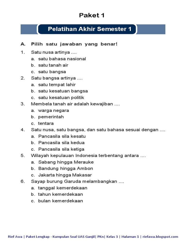 Makna sumpah pemuda bagi bangsa indonesia adalah. Di bawah ini contoh soal pilihan ganda uts pkn k13 kelas 3 semester 2. Uni mengamalkan sila pertama dengan … sebelum dan setelah makan. There was a problem previewing soal uts pkn kelas 1 semester 2.pdf. Materi soal latihan ulangan kenaikan kelas ukk pkn semester 2 kelas 3 sd terbaru 2018 yang sudah dilengkapi dengan kunci jawaban. Pilihlah satu jawaban yang benar dengan cara memberi tanda silang (x) pada huruf a, b, c, atau d! Untuk soal dan kunci jawaban dapat anda unduh pada link di bawah. Jumlah soal isian singkat : Jumlah soal uraian / essay : Soal ukk pkn sd juga berlaku untuk tingkat madrasah ibtidaiyah kelas 3 sebagai bahan acuan pembelajaran dalam menghadapi ulangan pada setiap semester. Soal dan jawaban yang dibahas berikut hanyalah sebagai referensi bahan belajar bagi siswa dan guru dan orang tua dalam. Jumlah soal pilihan ganda : Pamit kepada kedua orang tua 5.